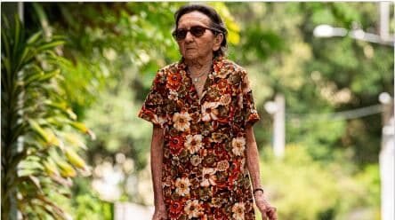 “Em certo momento de O Agente Secreto, há uma cena de rua à luz do dia, e essa mulher simplesmente entra em cena, e quase chega até a câmera. Enquanto ela está ali, você pensa: espero que este filme saiba que deveria ser mais sobre essa pessoa – alguém que parece ser mais jovem do que realmente é. Ela é uma verdadeira dona, mas de um jeito único, peculiarmente glamorosa em um vestido caseiro de estampa botânica e óculos escuros enormes.