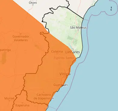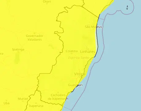 O alerta de menor gravidade atinge todos os municípios do Espírito Santo. A previsão é de chuva entre 20 e 30 milímetros por hora, ou até 50 milímetros por dia. Há baixo risco de alagamentos e pequenos deslizamentos.