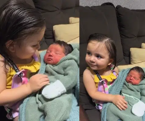 A frase espontânea virou o ponto alto do vídeo, mas não foi só isso que chamou a atenção. Encantada, Acsa passa a observar cada detalhe do irmãozinho: faz carinho no rosto, nos pezinhos, na barriguinha e não quer largar o bebê de jeito nenhum. Quando os pais tentam levá-lo para o berço, ela se recusa a entregar e insiste em continuar com ele nos braços, como quem já assumiu o papel de irmã mais velha.