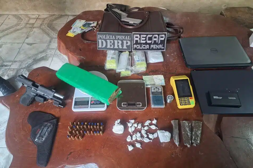 No total, as equipes apreenderam quatro armas de fogo, incluindo uma pistola 9mm com mira a laser e uma espingarda caseira, além de mais de 1 quilo de maconha, porções de cocaína, três balanças de precisão, máquinas de cartão, diversos aparelhos celulares, notebooks e munições.